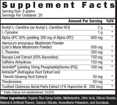Порошковая предтренировочная и ноотропная формула для повышения энергии, концентрации, ясности мышления и мотивации в течение дня и перед тренировкой.